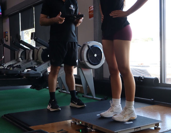 Force plates are specialised platforms with built-in sensors that capture detailed information about how your body produces and absorbs force during movement. When you stand, squat, jump, or land on a force plate, it records data hundreds of times per second, giving us insight into your movement that the naked eye simply can’t see.